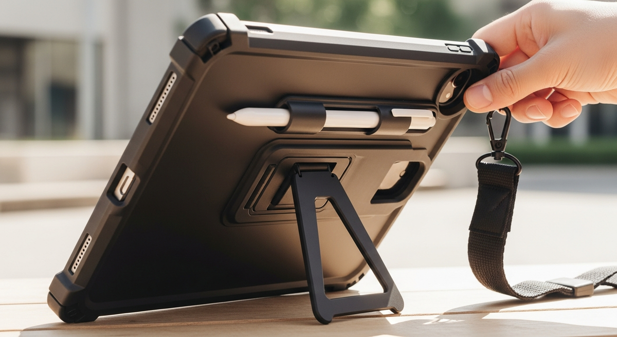 一番の魅力は三層構造で耐衝撃とされる堅牢な作りと、360°回転スタンドやハンドストラップ・ショルダーストラップが備わっている点です。付属のショルダーストラップでハンズフリーに持ち歩け、ペン収納もあるため子どもに持たせる場面や屋外での作業にも安心して使えるおすすめの一品です。